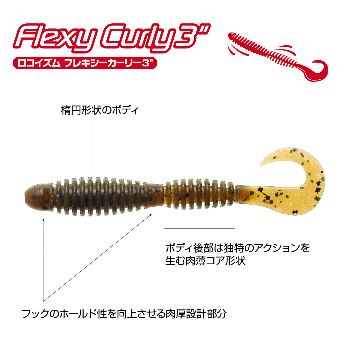 フレキシーカーリー3は楕円形状のアウトラインを持つリングシルエットに、素早い泳ぎ出しと、低速でもピリピリと動き続けるハイレスポンスなカーリーテールを組み合わせました。更に、ボディー中央から後部のコアを肉薄にする事で、テールのパワーを不規則にボディーに伝えつつ、適度なボディーロールを伴うとても生命感に富んだファジーなアクションを生み出します。連続したアクションの中に突如発現するこのファジーアクションは、これまでバイトに持ち込む事が難しかったテールtoノーズで追尾する魚に対し、優れたバイト誘発力を発揮します。