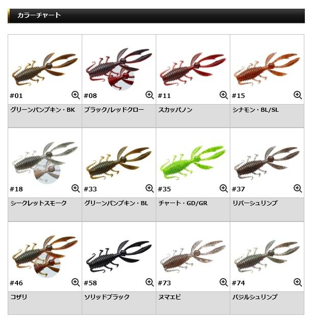 もちろんトレーラーとしてではなく、ドロップショットリグやキャロライナリグ等での単体使用も効果的。ツメによるアピールに加え、ボディサイドの4本の触手と2本のヒゲが各々別に微振動しバスの本能を刺激。スレたラージマウスバスのみならず、タフコンディション下のスモールマウスバスにも効く切り札となります。また、これらの細かいパーツは、ラインヨレの原因となるリグの回転やボトムで根掛かる原因となる横倒し防止のバランサーとしての役割も併せ持ちます。