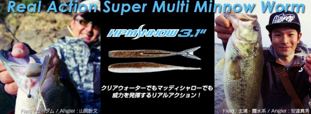 HP MiNNOW3.1"はリグへの幅広い適応性と、あたかも本物のベイトフィッシュかのごとくアクションするスーパーマルチミノーワームである。フィーディングのバスのみならず、ニュートラルなバスに捕食スイッチを入れバイトさせるために必要なことはルアーを本物のベイトだと思わせること。ボディー形状を追求し、動かしたい部分だけが艶かしく動き、動かしたくない部分が不自然に動くことを徹底排除。ノーシンカーリグによるi字アクションでは不自然なふらつきを抑え、またサスペンドしているバスにも視界にルアーをとどめられるようマテリアルを吟味しスーパースローシンキングに設定。ボディをくねらせながらのキレのあるダートアクションや細かなシェイクにも追従して動くVテール、ただ巻きでは後方ボディを波打つよう震わせながら泳ぐさまは、まさにリアルアクション。バスがルアーを見切る要素を削ぎ落したHP MiNNOWはミノーワームの次世代スタンダードとなる。