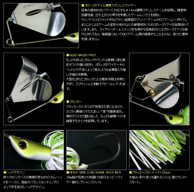 バスルアーの延長線上でしかなかった従来のバズベイトとは比較にならない音と波動、そして強度を追求した“HUGE・バズベイト”は、海外釣行でのテストを積み重ねて生まれた本気の怪魚仕様です。