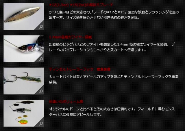 その言葉通り、#12(1.5oz)や#15(2oz)という超巨大サイズのブレードが発生する波動とフラッシングは、ビッグベイト並み、もしくはそれ以上の集魚力を備えています。