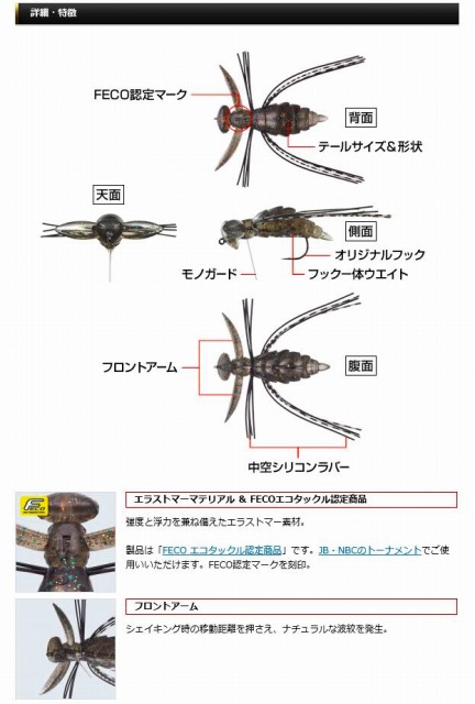 エラストマーボディの背中側を盛り上げたデザインに加え極小のフック一体ウェイトを内蔵することにより、水面でフックを下にして、ややテール下がりで浮く姿勢をキープ。高いフッキング率を誇るのみならず、テールをついばむようなバイトもフッキングチャンスになります。