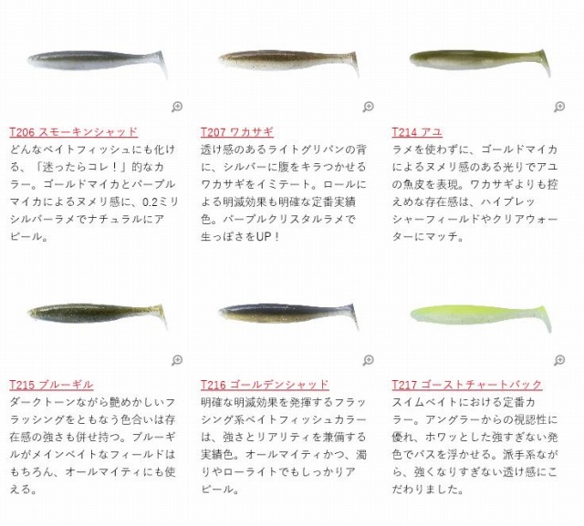 塩を背中側は少量、腹側は高密度に混入。低重心化によるスイミング姿勢の安定化と、ノーシンカーリグでの快適なキャスタビリティ、そして浮き上がりを抑制する自重も確保しています。また、エビ・イカ・ベイトフィッシュの粉末を入れることで、匂いでもバイトを促進します(一部、天然エビフォーミュラーのカラーもあります)。