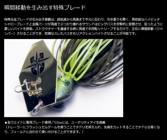通常のチャターは、リトリーブスピードが低いと振動が得られず、気持ち良い振動が得られるスピードでついつい使ってしまうものでした。その速いリトリーブスピードでは、活性の高いバスしか釣ることができず、ストライクゾーンの狭いルアーだったと言えます。フラッシュジャンパーはラインを引き込むぐらいの超低速リトリーブから、振動が手に伝わる全スピード対応。高速に反復するブレードのピッチの速さに驚かれることと思います。ラインを引き込むだけで素早く動き出し、カーブを描く「スローローリングフォール」を駆使することで、バスの潜む水深までカバー。活性の低下したビッグバスをもバイトに持ち込む性能は、新しいチャターベイトの世界を切り開きます。