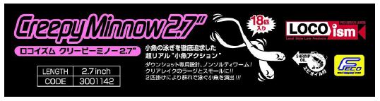 Locoismクリーピーミノー2.7”は一見小型のストレート系ワームようですが、スモールからラージ、山上湖やリザーバーなど、クリアレイクでワカサギ等を捕食するバスをターデットに、小魚の泳きを徹底追求し作り上げられたDS(ダウンショット)専用の超リアル「小魚アクション」ワームです。