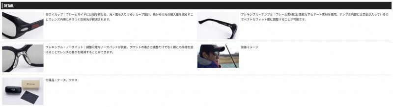 コンベックス社のCR-39素材の『ポラウィングSPX』を採用。偏光度の高い特殊な偏光フィルターを挟んだレンズで、透明度が高く歪みも少ないのが特徴です。又、可視光線透過率の高いレンズを多く展開することで、フィッシングシーンで重要とされる朝夕や曇りのローライトコンディションでも明るい視界を作り出します。