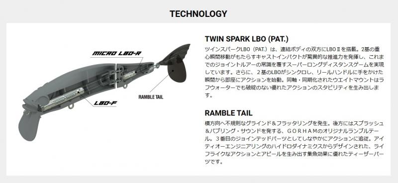 ジョイントボディによるナチュラルなテールスイングと、ツインスパークLBOと同軸・同期化したローリングアクションによるフラッシング、水面で発生させる撹拌水流と引き波の相乗効果により圧倒的なフィーディングインパクトを発揮。