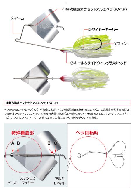 トラブルの少ないシンプルな構造ながらも、独特な形状のペラにより複雑なサウンド&強烈な波動を生み出すラウドバズ。圧倒的な浮き上がりの速さでプロダクティブゾーンをスローにロングトレースできることから、そのサウンドで徹底的にバスをイラつかせて水面が爆発するかのような激しいアタックを誘発します。