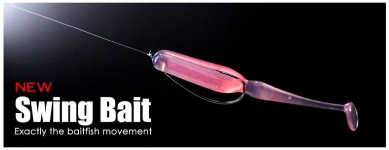 『スイングインパクト』や『イージーシャイナー』のアクションとは明らかに異なる、バスをスプークさせずに惹きつけるロールを抑えた極めて小刻みなテーリングが『スイングベイト』の身上です。