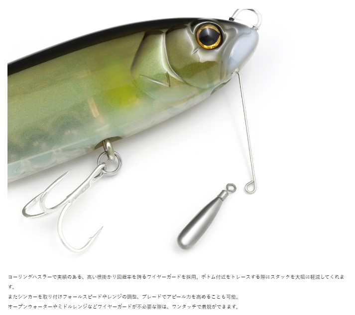 咬合力の強い怪魚も視野にいれた強度設計、また貫通ワイヤーやスイベルフックアイも備わり、様々なシーンで活躍が期待されるディープ攻略のシンキング・シングルスイッシャーです。