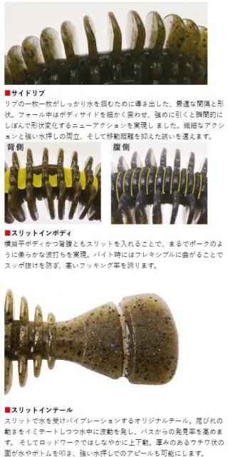 ●柔らかくウネり、フッキング率も高めるスリット入り横扁平ボディ。