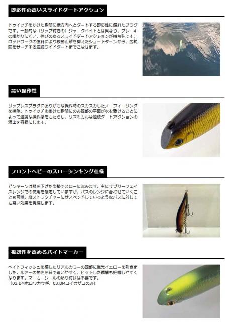 これまでビッグベイトの特権だった水面下でのダートアクションを80mmのボディーで見事に演じます。
