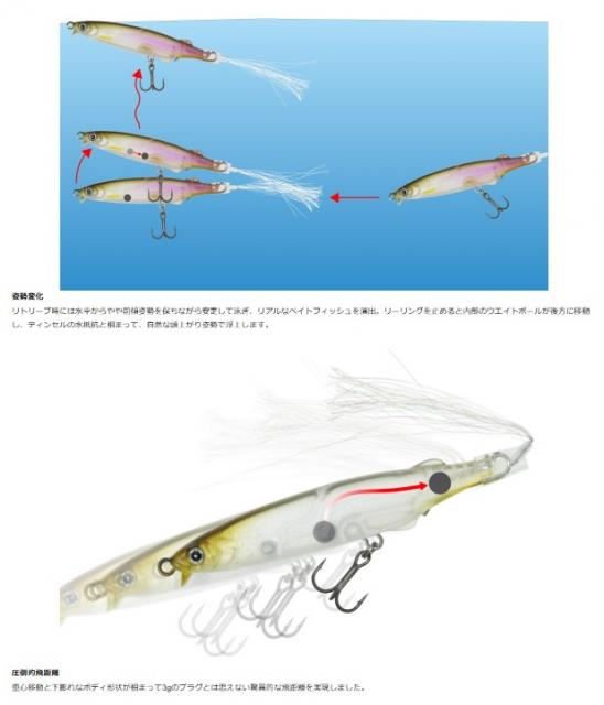 後方にボリュームを持たせたボディと重心移動システムがあいまって、自重3gのプラグとは思えない程の飛距離を実現。 極小のリップは動かすためではなく、姿勢の安定性と抵抗感のために搭載。誰が巻いても安定してI字軌道を描き、 ノー感じになりにくくなっています。