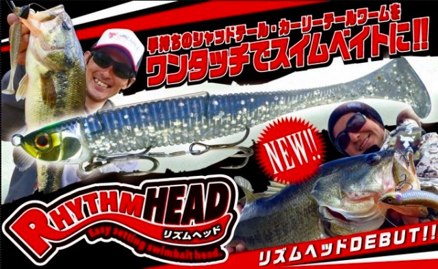 シャッドテールワームやカーリーテールワームなどのスイミング系ワームを装着するだけで、リアルなヘッドシルエットのスイムベイトに早変わりさせてしまうがリズムヘッドです。