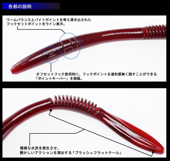 1番の特徴であるボディ前後に設けられたブラッシュフラッシュテールにより、複雑な水流を発生させ、艶めかしいアクションを演出します。また、ブラッシュ形状によりバキューム性がアップ、フィッシュフォーミュラ配合によるバイトタイムの継続により、フッキング率が格段にアップしました。