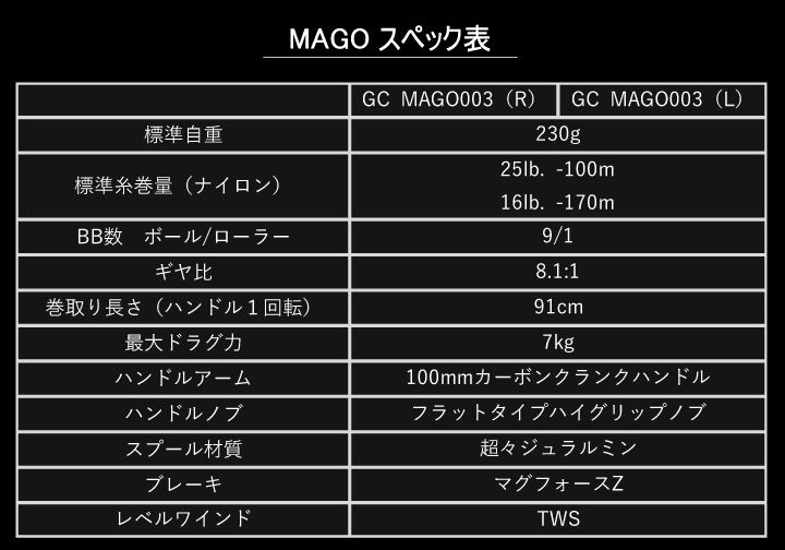 ジョインテッドクロー178をはじめ、KAITENやジョインテッドクロー230マグナム、さらにはジョインテッドクロー303-尺-ONEに至るヘビーウエイトルアーをストレスなくキャスト・操作する為に開発され、ビッグベイトの使用に特化したTATULA MAGOの血を継承したヘビーデューティーリール!