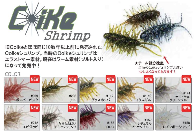 10数年前に発売された先代Coikeシュリンプはエラストマー素材でした。New Coikeシュリンプはソルト入りワーム素材になって復活しました。