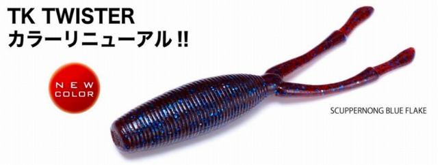 TKツイスターは、あらゆるリグで使用可能なスーパー・マルチファンクションワーム。軽くトゥイッチを加えれば、テールをくねらせながら左右へとダートアクションを発生。ノーシンカーやテキサスリグでは、甲殻類を思わせる2本のテールが生み出す繊細なバイブレーションとボディがかもし出す独特な存在感によってモンスターの意識をロックオンします。