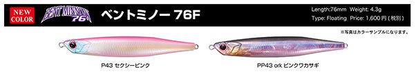 ベントミノー76はアングラーの多いハイプレッシャーな状況やベイトフィッシュが小さいフィールドでも、より多くのバイトを確実に得るために開発された。サイズダウンしても圧倒的誘発力は健在で究極のナチュラル3Dダートアクションでターゲットを悩殺する。最大の特徴であるベントしたボディは、泳ぐ力を失い水面に横たわる小魚をスーパーリアルに再現。止めているだけでもターゲットの反応が明確に違うことでその効果を証明してくれる。この視覚的要素もさるころながら、特筆すべきは他に類を見ない唯一無二のアクション。上下左右斜めと予測不能の3Dダートアクションは、ターゲットを疑わせることなく錯覚させ、現実にバイトに持ち込んでくれる。