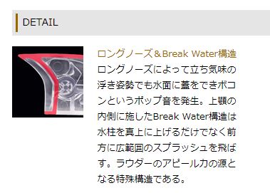 例えばペンシルベイトではアピール不足な時。広範囲にディープまで、さらにカバーの中に潜むバスに気付かせ呼び寄せることができるのはポッパーならではの性能であり役割である。飛距離やアキュラシーが良いのはもちろんアピール要素として重要なのがポップ音、スプラッシュ、ラトル音、移動距離を抑えた泳ぎ。プロダクティブゾーンの狭いピンスポットからオープンウォーターの広大なウィードエリアまで場所を選ばず使えること。全性能を向上させることでポッパーそのものの存在感を大幅に向上させることを目指し開発された。