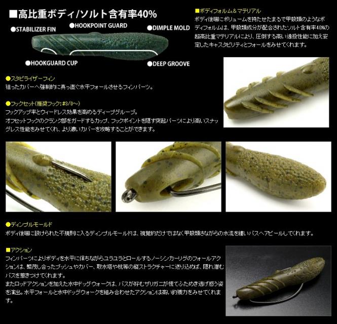 無駄なパーツが省かれたボディの両側面に備わる特徴的なフィンパーツにより、フックをセットしてもフォール姿勢は極めて水平を保たれ、カバー攻略を意識したスナッグレス性の高いフォルムで、狙ったカバーへと確実にフォールさせることができます。
