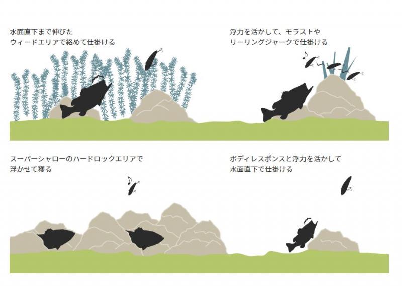 ■モラスト、ストップ&ゴーやリーリングジャークでのシャローレンジでよリアクションの多様性+。
