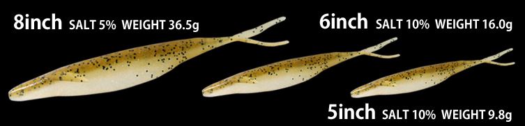 ノーシンカーでは、アユやハスが水面へ逃げ惑い、時折勢いよく水面から飛び出すような跳ね上がるダートアクション、スプリットショットやキャロライナリグのボトムレンジでも、バスに気付きボトムから突然現れ姿を隠すような跳ね上がるイメージでアクションすれば、“サカマタシャッド”の性能を発揮し、いとも簡単にバイトへと導いてくれます。