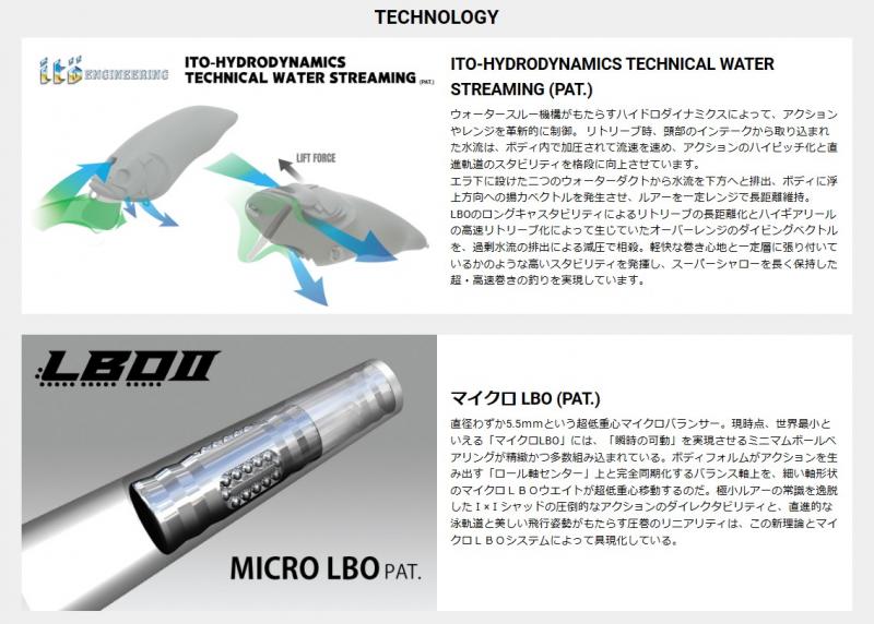 伊東は異次元のシャローランナーを具現化するため、POPMAX、XPOD、サイクロンなどで導入してきたウォータースルー機構(PAT.)を導入。ボディ内に取り込まれた水流の作用によって、ルアーアクションやレンジ・コントロールなどを二次的に司るハイドロダイナミクスを追求してデザイン。FURIOUSの、バーチャルなリップの如く作用させるウォーターストリーミングは、圧巻という他ない。