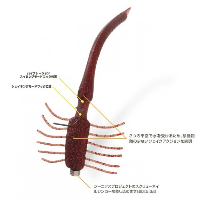 アイデアマン青木哲プロデュースのネコリグ専用ワーム・リグラー。シェイクやスイミング時の水抵抗を計算し尽くしたデザインで、移動距離の少ないシェイクモードや、適度なバイブレーションが発生するスイミングモードをフック位置のみで実現できる。ガードなしフックでもスナッグレス性に優れ、ラインを張り気味にすれば根掛かり回避力は爆上がりとなる。