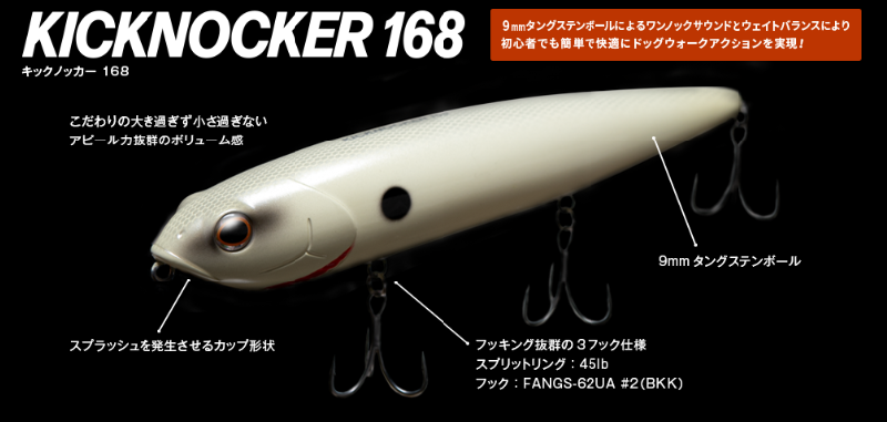 フィッシュアロー×テッケルコラボのキックノッカー168は、もっともドッグウォークアクションさせやすいビッグペンシルベイトです。9mmタングステンボールによる驚異の飛距離と大きなワンノックサウンドで広大なフィールドを攻略できます。