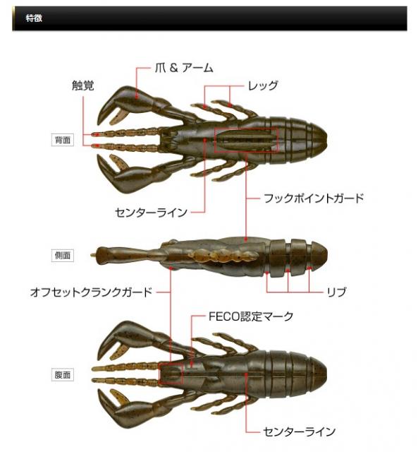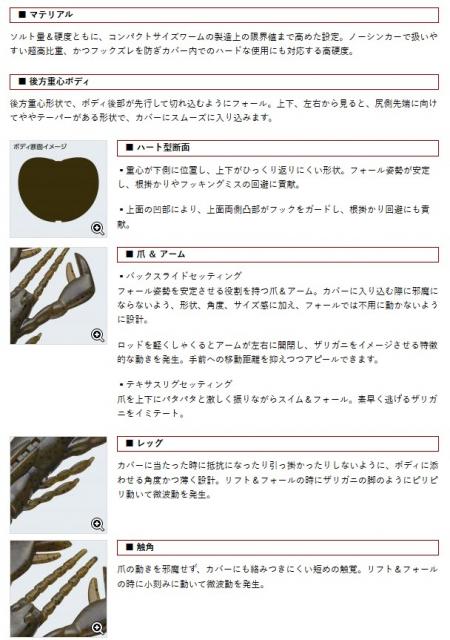 また、テキサスリグやリーダーレスダウンショットリグにセットすると、フォール時に爪をバタバタと動かすハイインパクトなベイトへと変貌する。