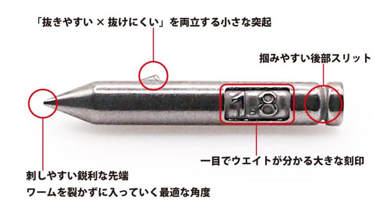 指で簡単に装着・交換できる高性能ネイルシンカー。 先端角度を最適化し、ワームへスムーズに差し込み可能。 表面積を小さくして重量効率をアップ、姿勢も安定。 後部スリット付きでリグチェンジもラクラク!
